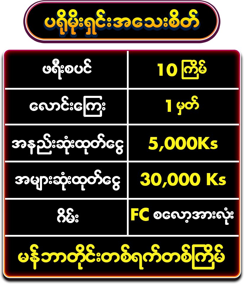 ✅ ပ႐ိုမိုးရွင္းအား 01/01/2026 မွစၿပီး တစ္ရက္လွ်င္( ျမန္မာစံေတာ္ခ်ိန္ (10:30 P.M To 10 :30 P.M ) ႐ိုး႐ိုးသြင္းေငြ 10,000 Ks သြင္းကစားထားေသာ မန္ဘာတိုင္း ေနာက္ေန႔ မွာ customer service သို ဆက္သြယ္ ရယူႏိုင္သည္