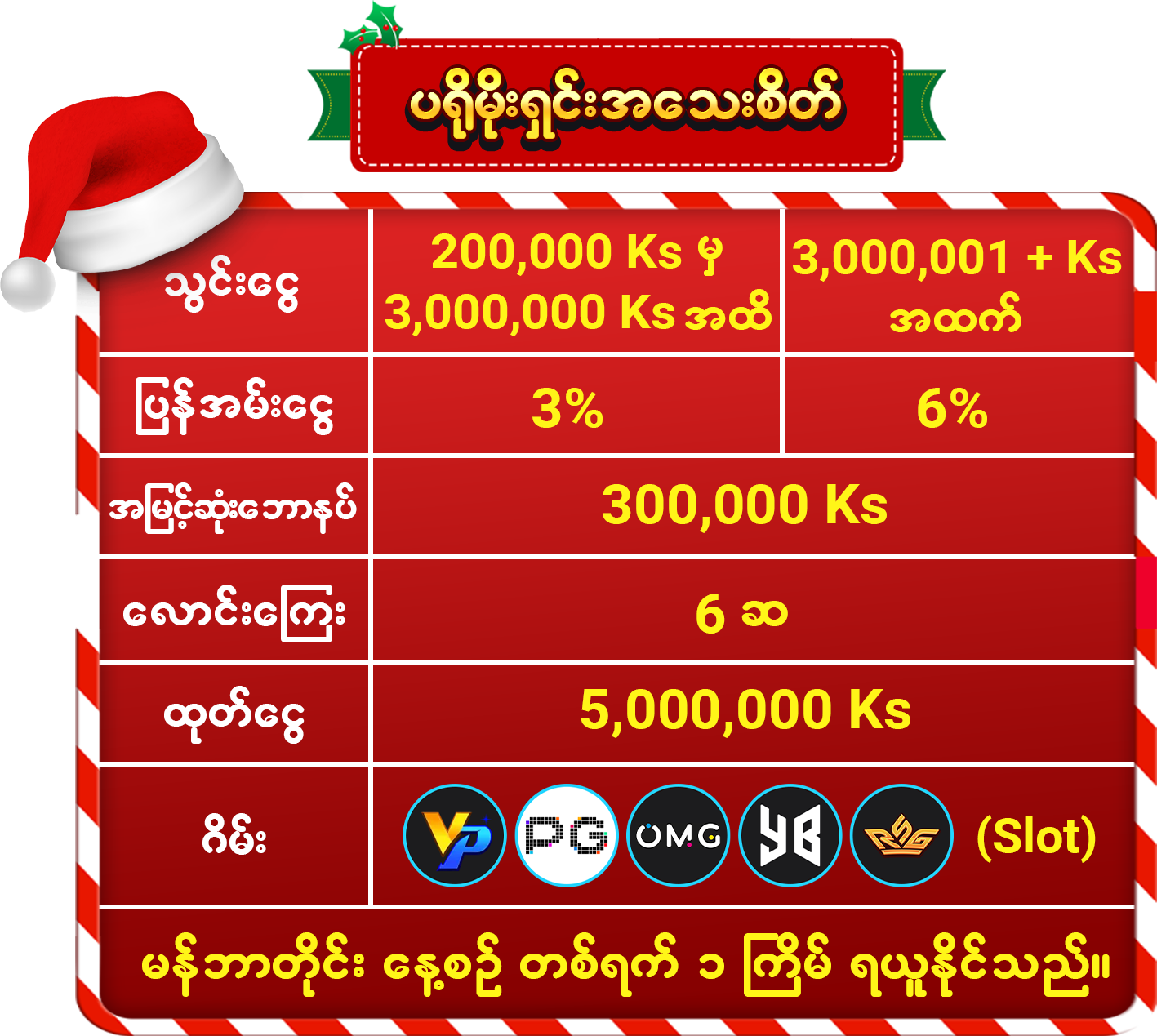 2. Slot ဂိမ္းအားလုံးတြက္ခ်က္ေပးပါသည္။(YGG ၊ ACE WIN မပါဝင္ပါ)အႏိုင္ရရွိေသာဆုမ်ားကို ႀကိမ္ေရတစ္ဆကစားၿပီးမွသာလွ်င္ေငြထုတ္ႏိုင္မည္။